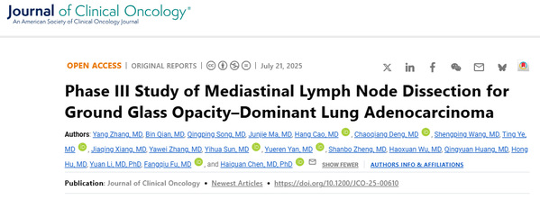 2025年7月21日,复旦大学附属肿瘤医院胸外科主任陈海泉教授团队在《美国临床肿瘤学杂志》(JCO,Journal of Clinical Orthodontics)在线发表题为“Phase Ill Study of Mediastinal Lymph Node Dissection for Ground Glass Opacity-Dominant Lung Adenocarcinoma”的研究论文。该研究证实,如果术前或术中准确判断淋巴结阴性的早期肺癌患者,可以不清扫淋巴结。相较于淋巴结清扫的患者,不清扫淋巴结的患者组生存情况没有差异,且手术效率更高、术后不良反应更少、住院时间更短。