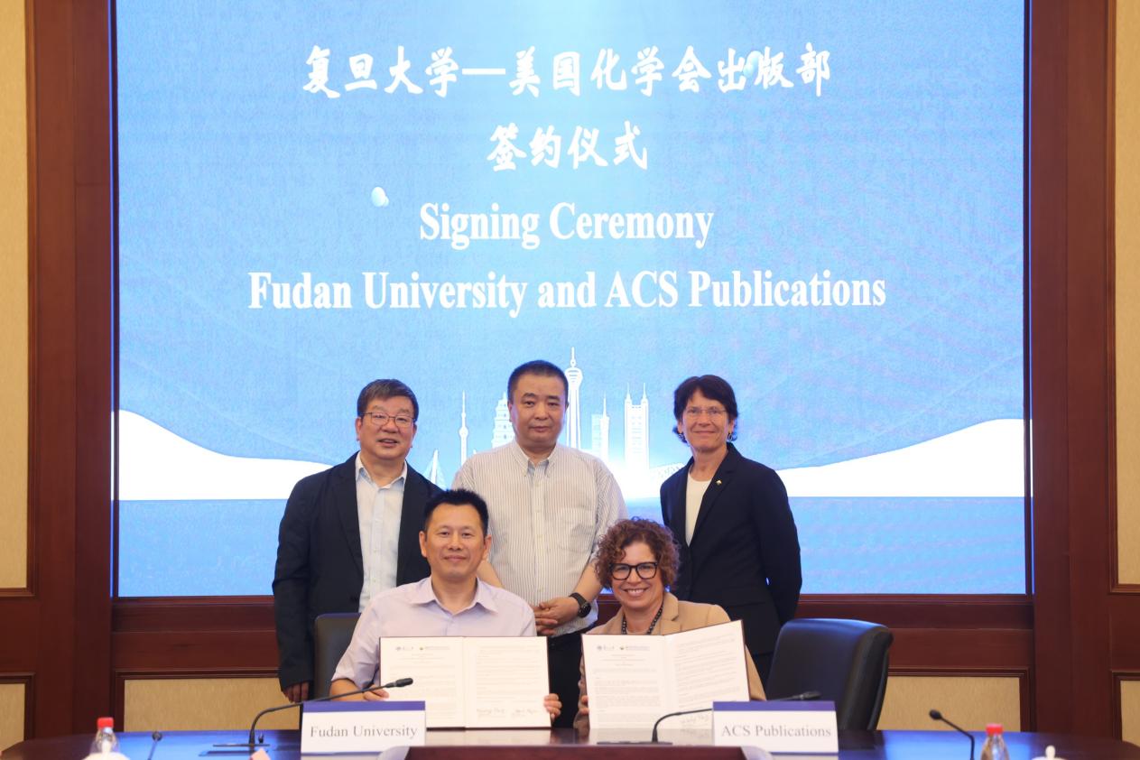 中国科学院院士、复旦大学校长助理、科学技术研究院院长彭慧胜与Sarah Tegen代表双方签约。金力,中国科学院院士、复旦大学智能材料与未来能源创新学院院长赵东元,美国斯坦福大学教授、ACS Central Science主编、2022年诺贝尔化学奖得主Carolyn Bertozzi共同见证签约。