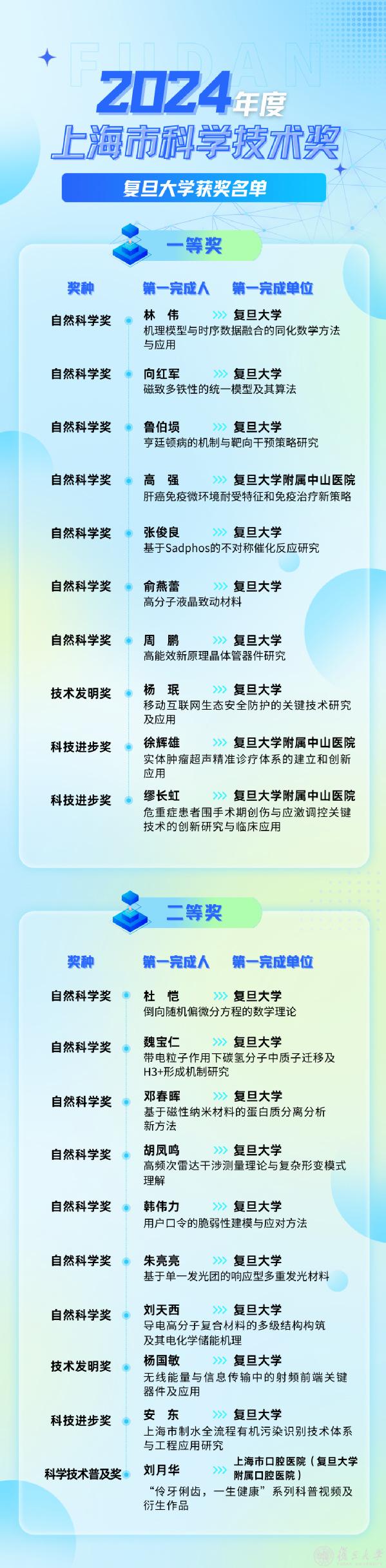 8月26日,2024年度上海市科学技术奖评选结果新鲜出炉!本年度我校再创佳绩,获奖项目共计20项,其中一等奖10项,二等奖10项。获自然科学奖一等奖7项,全市第一。20位第一完成人中50岁及以下中青年科学家共13位,年龄最小的32岁。