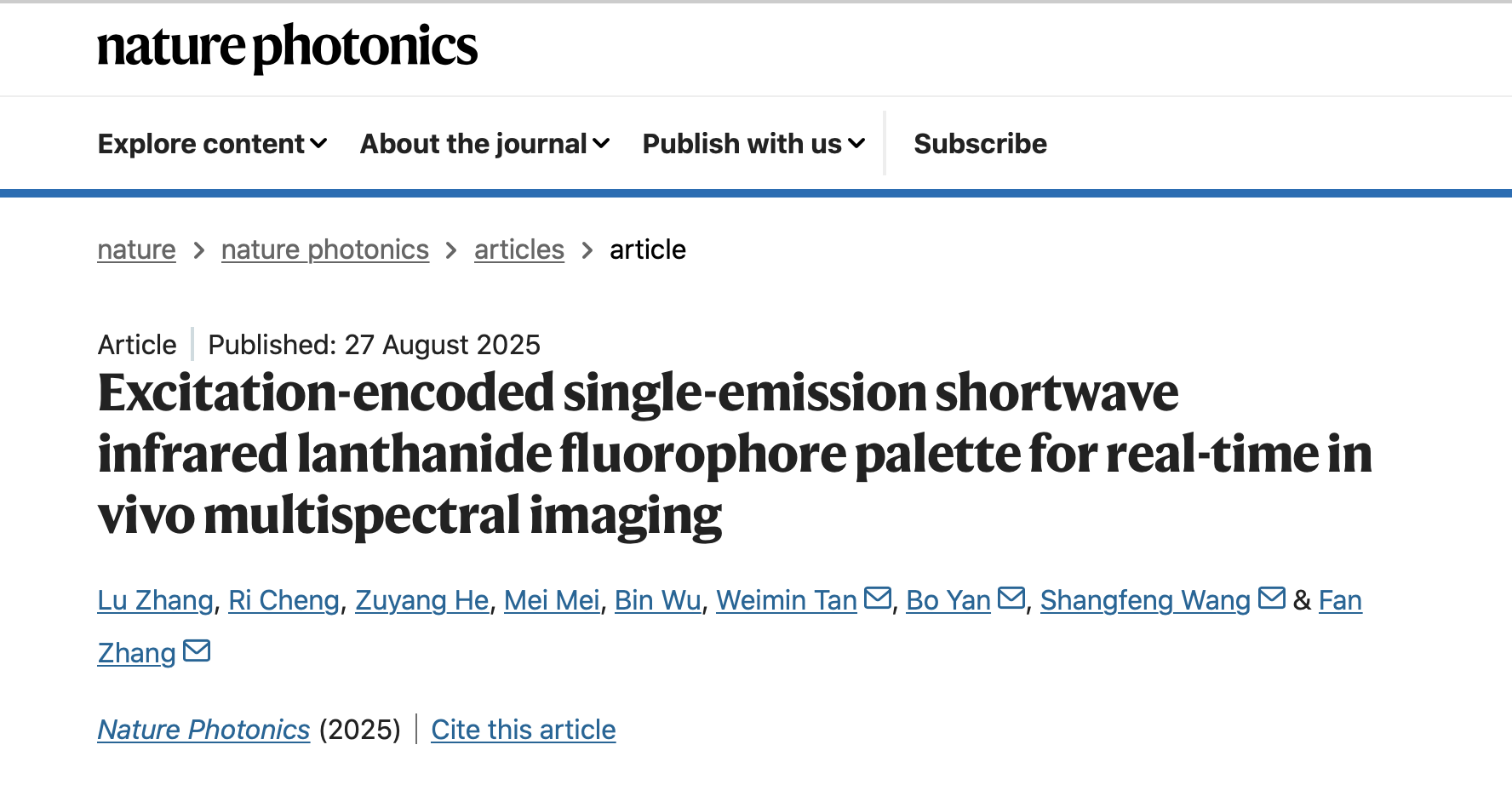 8月27日,相关研究成果以《基于激发谱编码的单发射短波红外镧系荧光团调色板:用于实时活体多光谱成像》(Excitation-encoded single-emission shortwave infrared lanthanide fluorophore palette for real-time in vivo multispectral imaging)为题,在线发表于《自然光子学》(Nature Photonics)