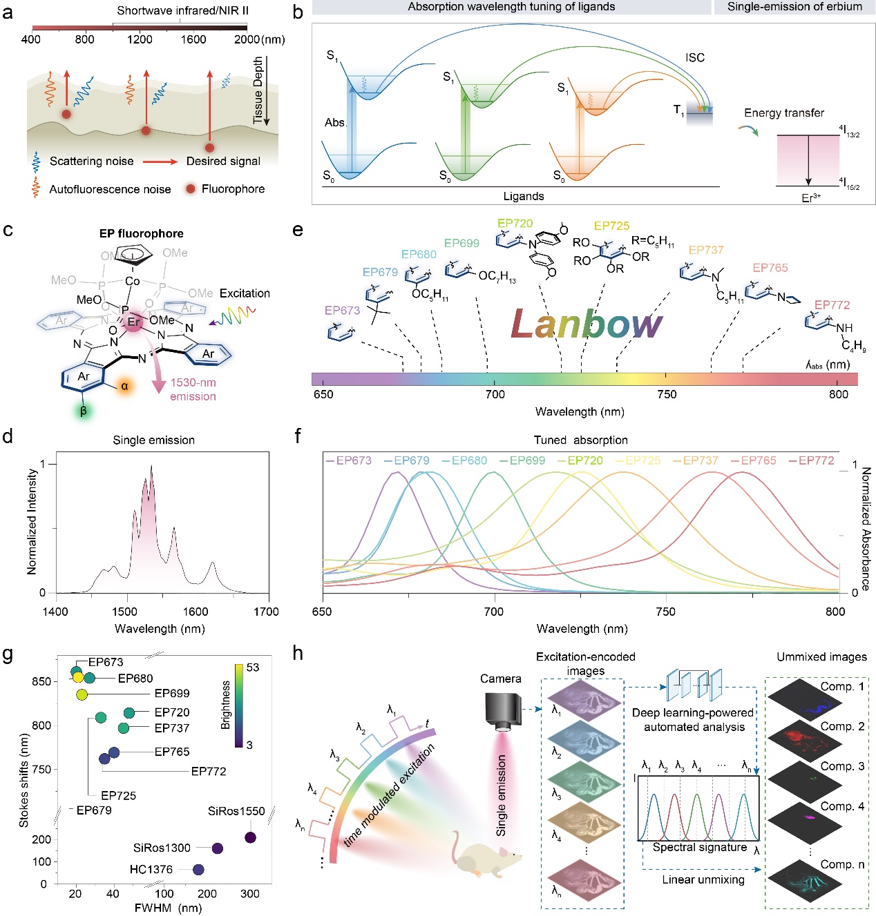 针对以上难题,张凡团队利用稀土元素铒(Er3+)的独特光学特性,通过分子工程设计构建了一系列具有三明治结构的新型酞菁铒配合物探针“镧系彩虹(Lanbow)”。它们的吸收波长分布在673 nm至772 nm,但发射统一集中在1530 nm——一个组织散射较小、自发荧光几乎为零的光学窗口。