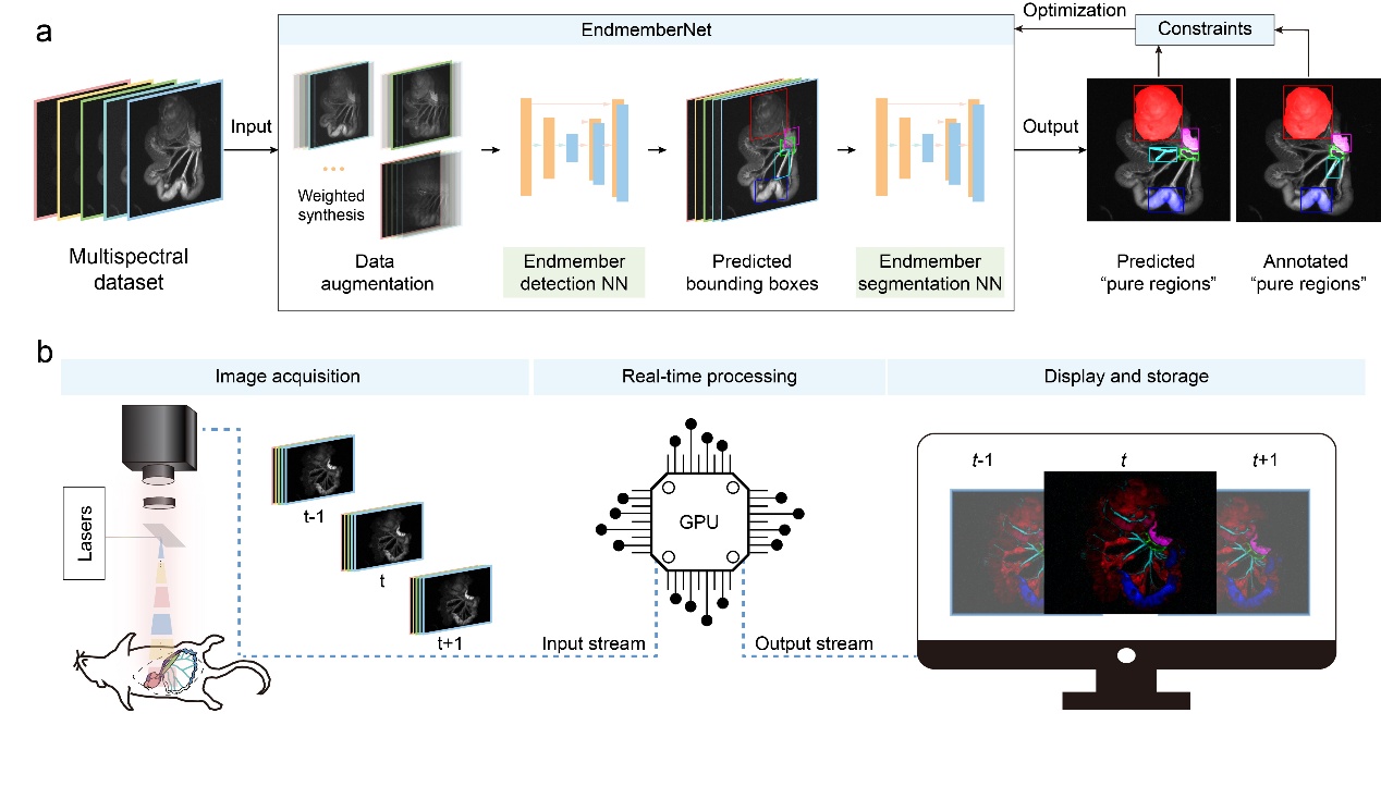 图2. 自动端元提取神经网络EndmemberNet训练示意图以及实时多光谱成像工作流程图。