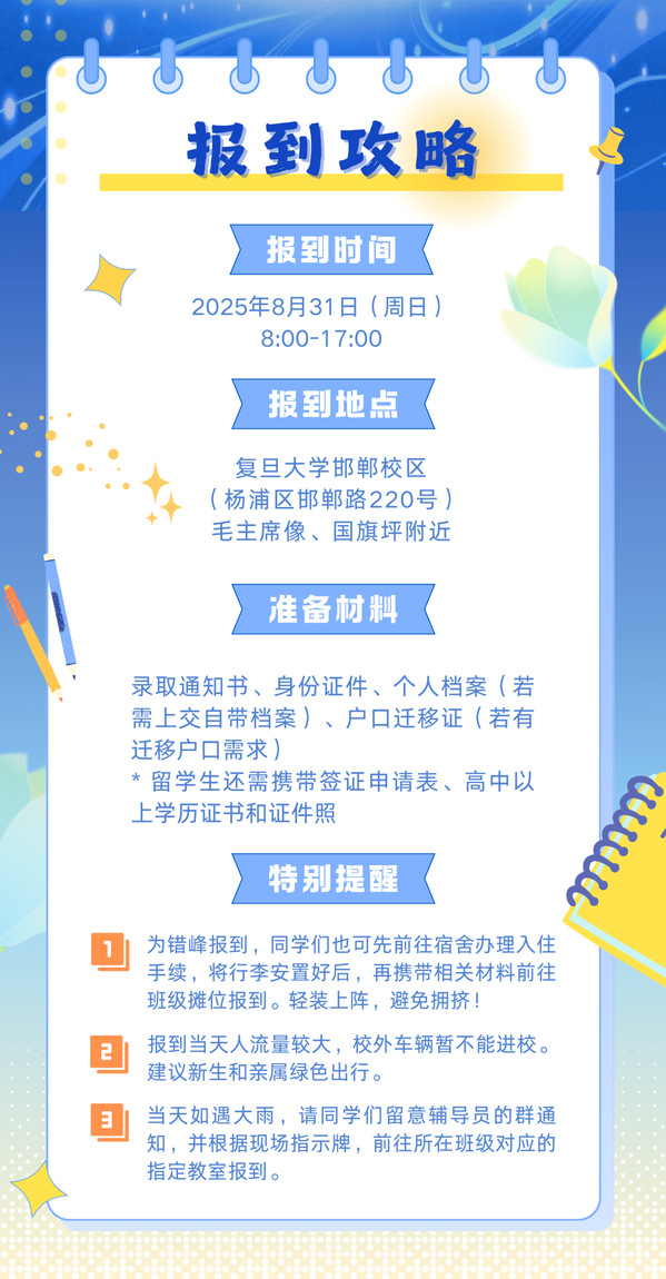 亲爱的2025级新生,欢迎你们加入复旦大家庭。我们将在这片百年学府的土地上与来自世界各地的你们见面。这份超全的报到攻略是你与复旦故事的开篇,未来的日子里,愿每一位复旦人追逐理想,收获成长,让青春在旦复旦兮的时光里绽放光彩。