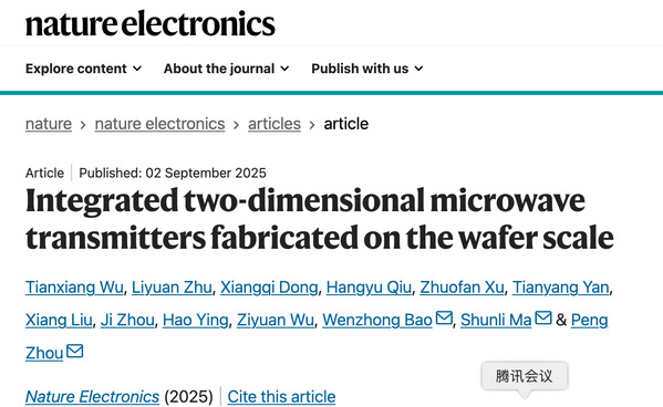 复旦大学集成芯片与系统全国重点实验室、集成电路与微纳电子创新学院马周鹏/马顺利/包文中团队在国际上首次实现了晶圆级二维全集成微波发射机系统的原型验证,并从麦克斯韦方程组出发揭示了射频波段原子界面超低损耗传输机制,开拓了二维射频电子学的颠覆创新领域。北京时间9月2日,相关成果以《晶圆级二维集成微波发射机》(“Integrated two-dimensional microwave transmitters fabricated on the wafer scale”)为题发表于《自然-电子学》(Nature Electronics)。