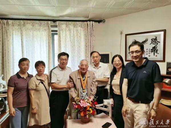 复旦大学党委副书记、上海医学院党委书记袁正宏代表学校,为103岁的离休干部汪枫叶颁发“中国人民抗日战争胜利80周年”纪念章,感谢他为民族解放和学校事业发展所作出的贡献,并祝愿他健康长寿。