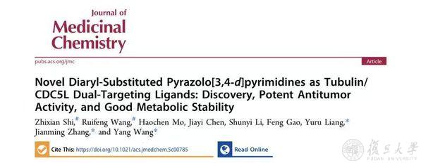 2025年8月7日,复旦大学药学院王洋团队在《药物化学杂志》(Journal of Medicinal Chemistry)发表了题为“Novel Diaryl-substituted Pyrazolo[3,4-d]pyrimidines as Tubulin/CDC5L Dual-targeting Ligands: Discovery, Potent Antitumor Activities and Good Metabolic Stability”的研究论文,报道了首个具有强效抗肿瘤活性和良好代谢稳定性的Tubulin/CDC5L双靶点配体,并阐明了其作用机制。