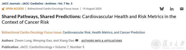 2025年8月19日,复旦大学附属肿瘤医院龙子雯团队联合复旦大学临床科学研究院、营养研究院(筹)高翔团队撰写了题为“Shared Pathways, Shared Predictions: Cardiovascular Health and Risk Metrics in the Context of Cancer Risk”的专题社论,发表于期刊 《美国心脏病学会杂志》(JACC: CardioOncology)。研究表明,传统的心血管疾病风险评分工具及综合性的心血管健康指标不仅能有效预测心血管事件,也显示出预测癌症风险的潜力。