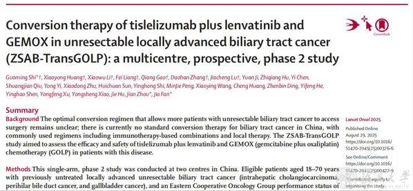 2025年8月30日,复旦大学附属中山医院肝胆肿瘤外科与肝脏移植科樊嘉团队在《柳叶刀-肿瘤》(Lancet Oncology)期刊上报道一篇题为“替雷利珠单抗联合仑伐替尼和GEMOX化疗治疗局部晚期不可切除胆道恶性肿瘤多中心、II期研究(Conversion therapy of tislelizumab plus lenvatinib and GEMOX in unresectable locally advanced biliary tract cancer (ZSAB-TransGOLP): A multicentre, prospective, phase II study)”的临床研究成果,创新提出“GOLP 转化方案”,给这些“无法手术”的胆管癌患者带来了新的生机。