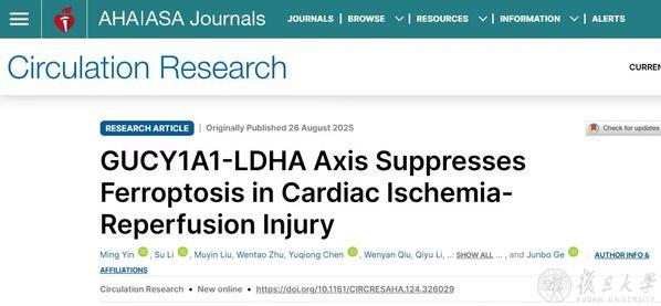 2025年8月26日,复旦大学附属中山医院心内科葛均波、钱菊英、陈章炜、李晨光团队在《循环研究》(Circulation Research)发表论文“GUCY1A1-LDHA Axis Suppresses Ferroptosis inCardiac Ischemia-Reperfusion Injury”,揭示了 GUCY1A1(鸟苷酸环化酶 1 可溶性亚基 α1)-sGC(可溶性鸟苷酸环化酶)-cGMP(环磷酸鸟苷)通路在心脏缺血再灌注(I/R)损伤中的关键作用,可以通过 LDHA(乳酸脱氢酶)的兼职(Moonlighting)功能调控 GPX4(谷胱甘肽过氧化酶 4 )磷酸化,抑制内皮细胞铁死亡,进而保护冠脉微循环。