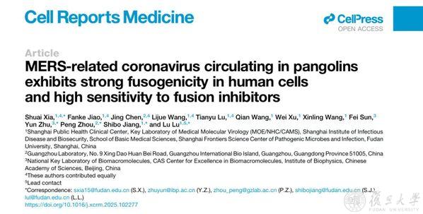 2025年8月6日,复旦大学基础医学院医学分子病毒学教育部/卫健委/医科院重点实验室、上海市重大传染病毒和生物安全研究院的夏帅、陆路、姜世勃及其合作团队在《细胞-报告医学》(Cell Reports Medicine)上在线发表题为“MERS-related coronavirus circulating in pangolins exhibits strong fusogenicity in humancells and high sensitivity to fusion inhibitors”的研究论文,发现MjHKU4r-CoV-1感染人源细胞后,诱发大量合胞体形成,并伴随显著炎症反应,进一步提示该病毒可能具有较高的致病性。
