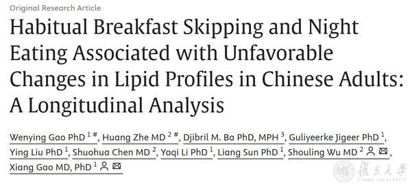 2025年8月20日,复旦大学营养研究院(筹)、复旦大学公共卫生学院高翔团队与开滦总医院吴寿岭团队合作在营养学领域期刊《美国临床营养学杂志》(The American Journal of Clinical Nutrition)上发表了题为 “Habitual Breakfast Skipping and Night Eating Associated with Unfavorable Changes in Lipid Profiles inChinese Adults: A Longitudinal Analysis”的研究论文,首次基于大规模人群的纵向数据证实,经常不吃早餐和夜间进食与血脂谱的恶化密切相关。这提示合理规划进食时间、保持规律饮食模式,对维护心血管代谢健康具有重要意义。
