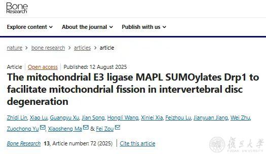 2025年8月12日,复旦大学附属华山医院骨科马晓生团队及邹飞团队在骨科学领域期刊《骨骼研究》(Bone Research)发表论文,题为“The mitochondrial E3 ligase MAPL SUMOylates Drp1 to facilitate mitochondrial fission in intervertebral disc degeneration”。研究首次揭示驱动椎间盘髓核细胞线粒体异常分裂的“分子开关”——线粒体锚定蛋白连接酶MAPL(mitochondria-anchored protein ligase),为开发椎间盘退变“治本”新疗法带来突破性进展。