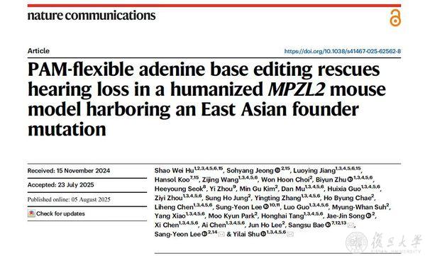 2025年8月5日,复旦大学附属眼耳鼻喉科医院舒易来团队与韩国首尔大学医院Sangsu Bae、Sang-Yeon Lee团队合作于8月5日在期刊《自然-通讯》(Nature Communications)上发表题为“PAM灵活的腺嘌呤碱基编辑技术恢复携带东亚始祖突变的人源化MPZL2小鼠模型的听力损失(PAM-flexible adenine base editing rescues hearing loss in a humanized MPZL2 mouse model harboring an East Asian founder mutation)”的研究论文,揭示了PAM灵活的腺嘌呤碱基编辑器(ABE)可挽救携带东亚始祖突变的人源化MPZL2小鼠模型中的听力损失,为遗传性听力损失提供了潜在的精准治疗策略。