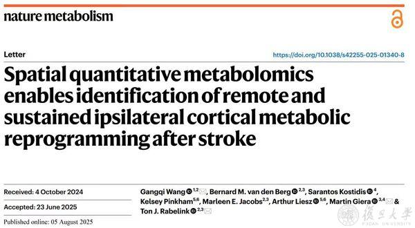 2025年8月5日,复旦大学生物医学研究院、复旦大学附属儿科医院王罡琦团队在《自然-新陈代谢》(Nature Metabolism)发表研究论文“Spatial quantitative metabolomics enables identification of remote and sustained ipsilateral cortical metabolic reprogramming after stroke”。该研究提出一种将¹³C标记酵母提取物作为内标,并结合MALDI-MSI的空间定量代谢组学方法,可实现200余种代谢特征的像素级归一化与相对定量,部分代谢物甚至可实现绝对定量。