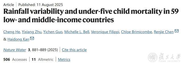 2025年8月11日,复旦大学公共卫生学院阚海东、陈仁杰团队展开了一项多国家流行病学研究,从多个维度定量评估了周期性的异常降水波动对于全球中低收入国家五岁以下儿童死亡的影响。研究结果以“Rainfall Variability and Under-Five Child Mortality in 59 Low- and Middle-Income Countries”为题发表在《自然-水》(Nature Water)期刊,首次揭示了降水变化对儿童健康的双重影响:一方面年降雨量增加对降低五岁以下儿童死亡率的保护作用,另一方面季节性降雨异常、极端降雨事件和持续潮湿天气带来的显著健康风险。