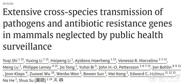 2025年8月26日,复旦大学公共卫生学院、上海市重大传染病和生物安全研究院粟硕团队联合中国科学院微生物研究所等多家单位,在国际学术期刊《细胞》(Cell)发表题为“公共卫生监测忽视的哺乳动物中病原体及抗生素耐药基因的广泛跨物种传播(Extensive cross-species transmission of pathogens and antibiotic resistance genes in mammals neglected by public health surveillance)”的研究论文,首次系统解析了大量此前未知的哺乳动物微生物组多样性,并绘制了临床重要ARGs的跨宿主共享网络,拓展了人类对于微生物组成和多样性的认知边界和深度,并为微生物源疾病和抗生素耐药性防控提供重要理论基础。