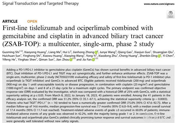 2025年8月21日,复旦大学附属中山医院肝胆肿瘤外科与肝移植科樊嘉团队在《信号转导与靶向治疗》(Signal Transduction and Targeted Therapy, STTT)期刊上报道了一篇题为“替雷利珠单抗联合欧司珀利单抗及吉西他滨和顺铂一线治疗不可切除局部晚期或转移性BTC的多中心、单臂、II期研究(First-line tislelizumab and ociperlimab combined with gemcitabine and cisplatin in advanced biliary tract cancer (ZSAB-TOP): a multicenter, single-arm, phase 2 study)”的临床研究成果,首次探索并揭示了PD-1抑制剂联合TIGIT抑制剂加化疗治疗胆道系统肿瘤的有效性和安全性,不仅填补了国际上这一领域的空白,更为那些无法手术的晚期胆道系统肿瘤患者提供了新选择。