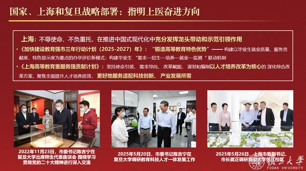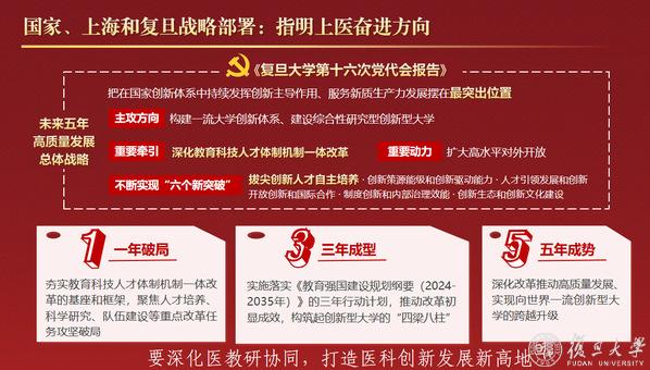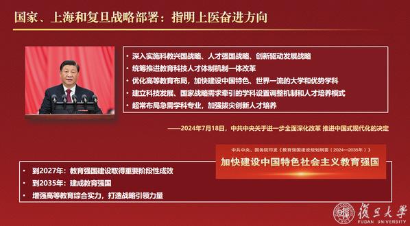 袁正宏指出,党的二十大和二十届三中全会对教育、科技、人才工作作出一体化战略部署,上海正大力推进高等教育“重服务、强贡献”,复旦第十六次党代会也明确提出“打造医科创新发展新高地”。面对新机遇新挑战,上医以建设世界一流医学院为目标,聚焦“健康中国”“健康上海”需求,持续推进教育综合改革。
