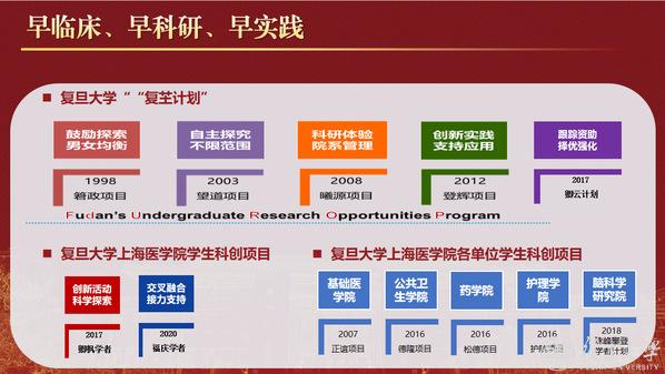 通过“学术上医”“创新上医”筑牢科学精神基石、系好学术生涯“第一粒扣子”鼓励本科生“早临床、早科研、早实践”,定期开展“学科周”,设立“复芏计划”、“卿枫学者”、“福庆学者”等科研资助计划。近两年,上医24名学生获国家自然科学基金青年学生基础研究项目,在“挑战杯”、中国国际大学生创新大赛(“大创赛”)、“明日科技之星”等赛事项目中屡获金奖。