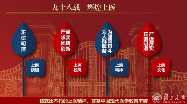 98载,上医人始终遵循“正谊明道”的院训,形成了“严谨、求实、团结、创新”的校风,传承“为人群服务、为强国奋斗”的精神,凝聚成了“正谊明道、严谨厚实”的文化。