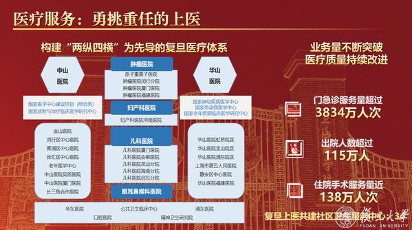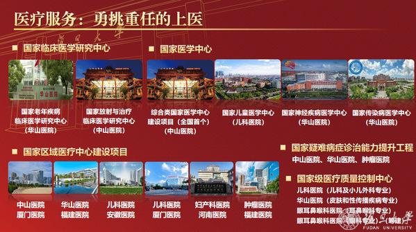 医疗服务,上医勇挑重任。目前,上医形成了“两纵四横”的医疗体系,获批建设4个国家医学中心、2个国家临床医学研究中心,输出建设6家国家区域医疗中心,业务量不断突破,医疗质量持续改进。各家附属医院开展了多项“世界第一”“全球首例”手术,积极承担国家任务、国家使命,延伸医疗服务,到祖国最需要的地方开展医疗帮扶援建。