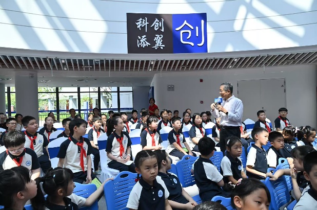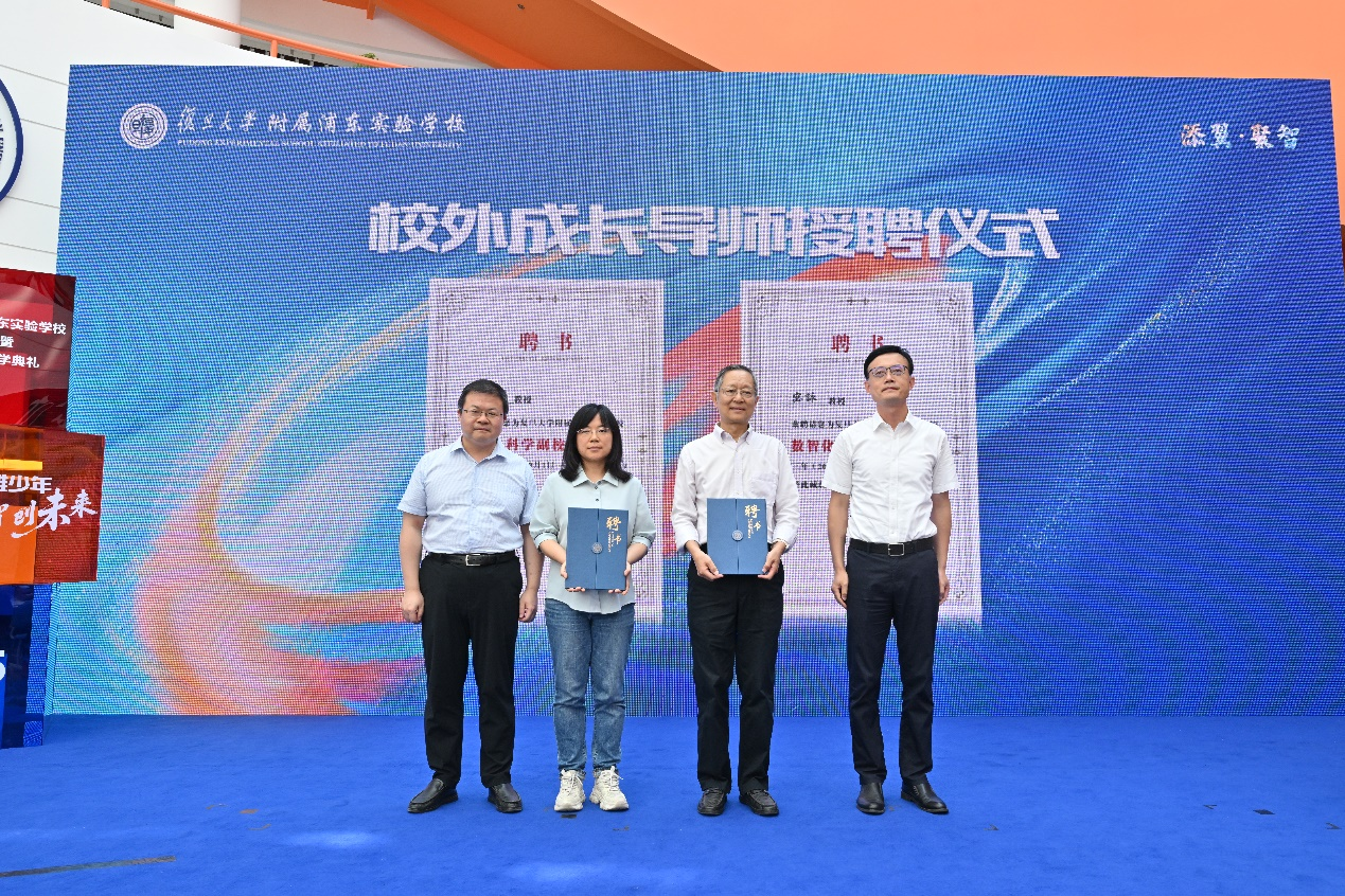 复旦大学基础教育集团主任赵昕、张江镇党委书记王庆颁发聘书,聘任复旦大学生命科学学院卢宝荣教授为科学副校长,聘任上海教育技术协会理事长、复旦大学现代物理研究所宓詠教授为数智化校外专家导师(代领)。