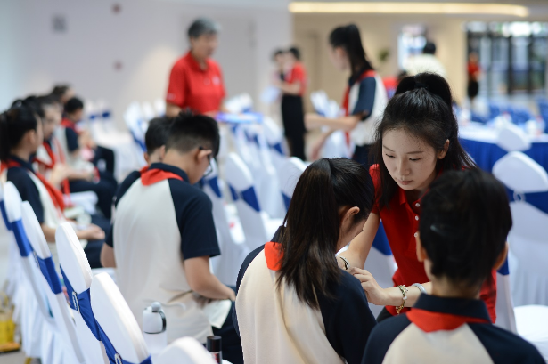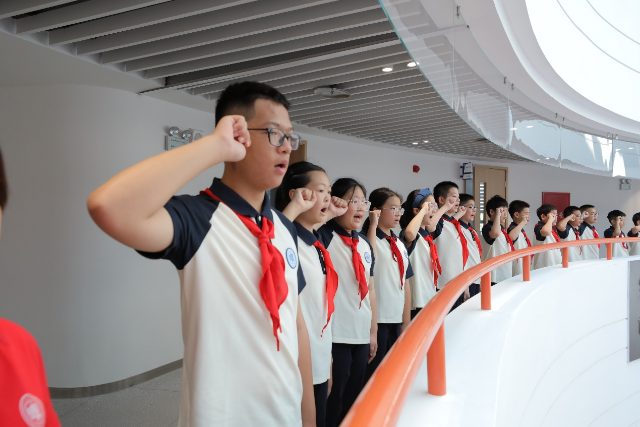 学校的建设与发展离不开建设单位和属地政府的辛勤付出与支持贡献,张江镇镇长李灿、金桥镇镇长臧萧、上海浦东开发(集团)有限公司董事长严炯浩、中建八局上海分公司董事长张正洪应邀上台,由学生代表为他们佩戴红领巾并献花,表达全校师生的感谢。