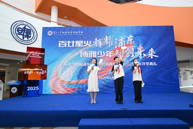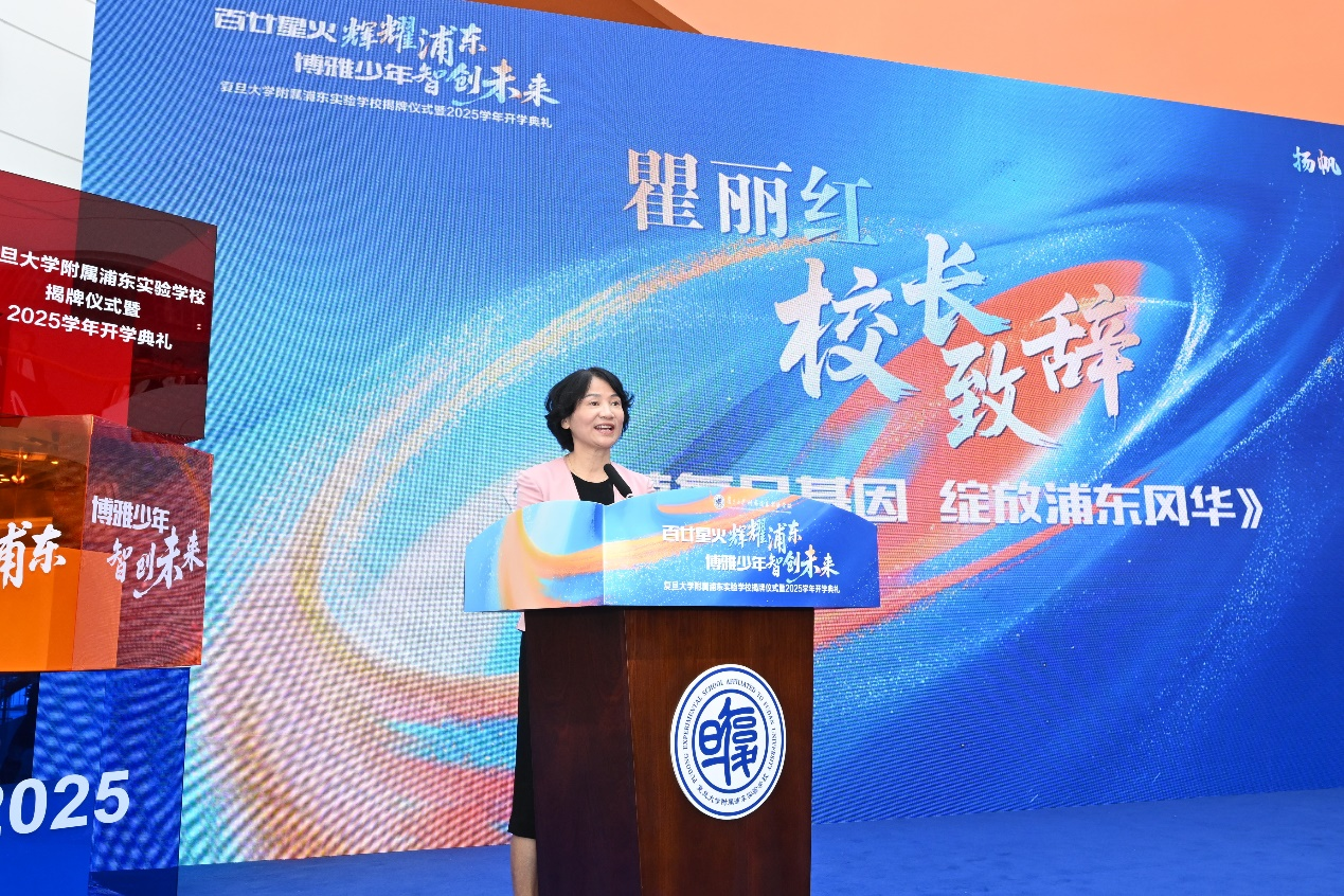 校长瞿丽红致辞,向师生、嘉宾传递期许——以复旦文脉为底色,融入浦东的开放视野和实践活力,构建“人文铸魂 + 科创赋能”教育新范式,培育博雅少年,智创美好未来。