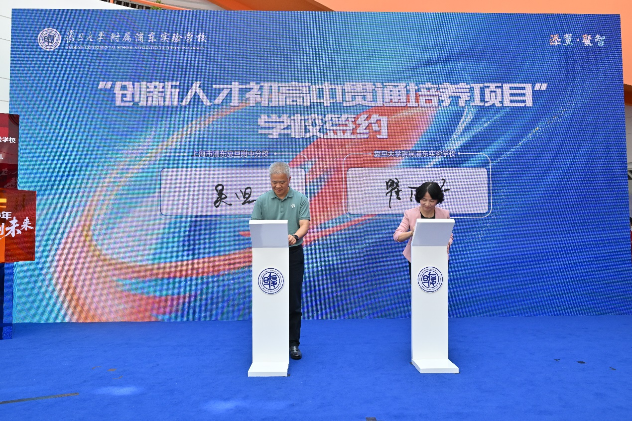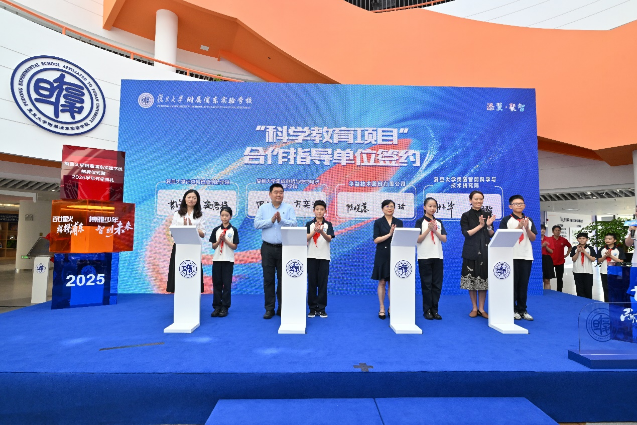 复旦大学集成电路与微纳电子创新学院党委书记罗凌、计算与智能创新学院副院长曹瑜、类脑智能科学与技术研究院副院长谢小华、华勤技术股份有限公司高级副总裁陈晓蓉与学生代表共同签署科学教育课程项目合作协议。复旦大学附属中学校长吴坚与瞿丽红校长签署上海市浦东复旦附中分校与复旦大学附属浦东实验学校共建协议。