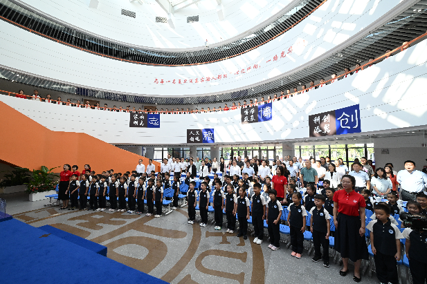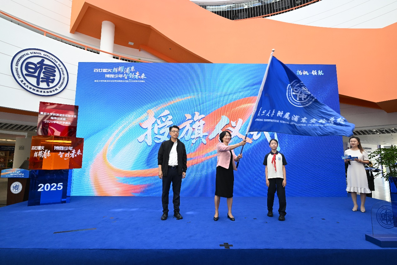 典礼伊始,短片《心之所向・一路光华》回溯学校筹备点滴,勾勒学校从规划到落地的成长轨迹。庄严的升旗仪式开启崭新学年,浦东新区副区长张娣芳,复旦大学党委常委、副校长汪源源共同为学校揭牌。浦东新区教育工作党委副书记、教育局副局长毛力熊授校旗。