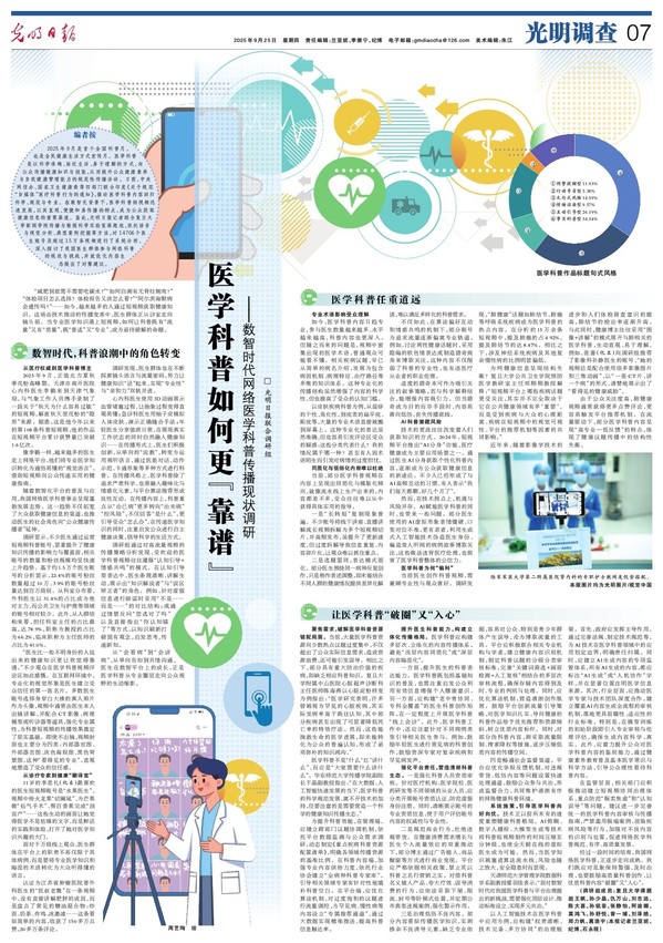 随着数智化平台的普及与应用,我国网络医学科普事业呈现蓬勃发展态势。这一趋势不仅拓宽了大众获取健康信息的渠道,也推动医生的社会角色向“公众健康传播者”延伸。