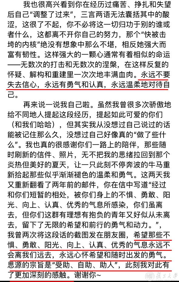 “希望那些不惧、勇敢、阳光、向上、认真、优秀的气息永远不会离我们远去,永远心怀希望和随时出发的勇气。思源的宗旨是‘受助、自助、助人’,此刻我对此有了更加深刻的感触。”