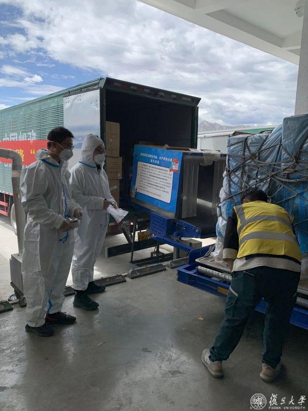 倪佳晟(左二)在拉萨贡嘎机场接收上海援藏物资
