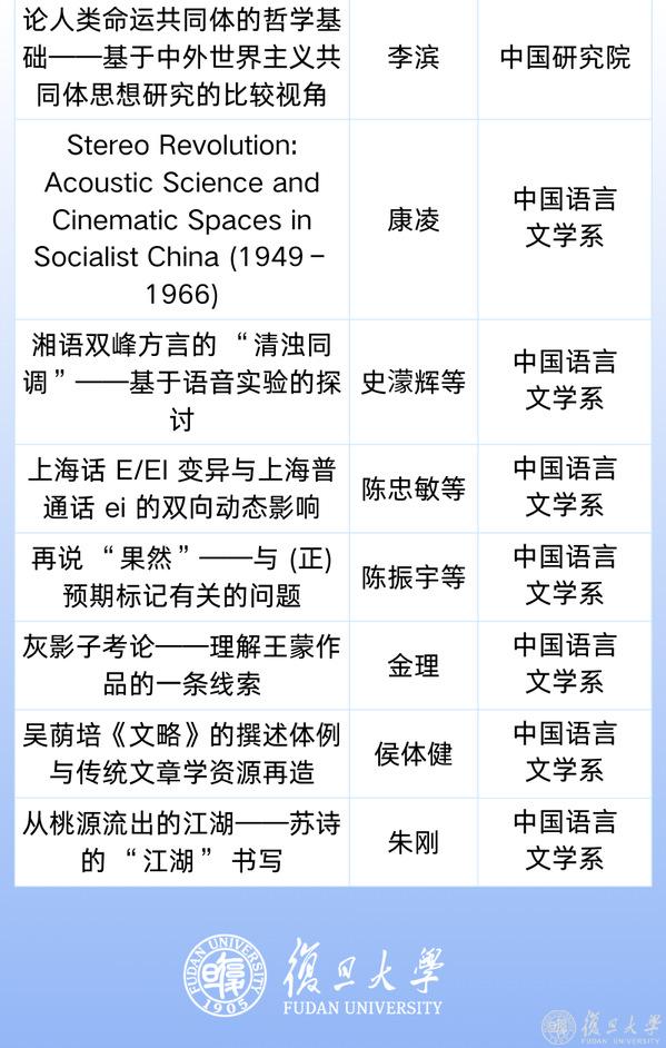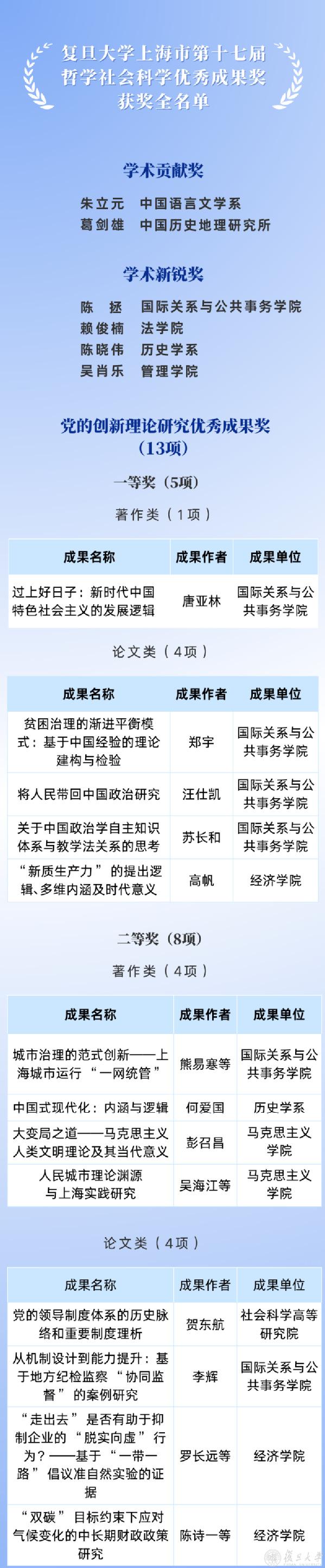 近日,上海市第十七届哲学社会科学优秀成果奖揭晓,复旦大学以139项获奖成果强势领跑,蝉联全市榜首。其中,一等奖43项、二等奖90项,获奖总数及一等奖数量均位列第一,再次彰显复旦哲学社会科学研究的雄厚实力。中国语言文学系朱立元教授、中国历史地理研究所葛剑雄教授荣膺学术贡献奖。