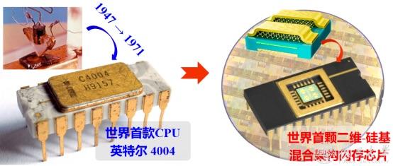 世界首颗二维-硅基混合架构闪存芯片。左侧为半导体晶体管从原型器件到第一款CPU。右侧为二维闪存器件结构、8英寸流片CMOS晶圆、二维-硅基混合架构闪存芯片。