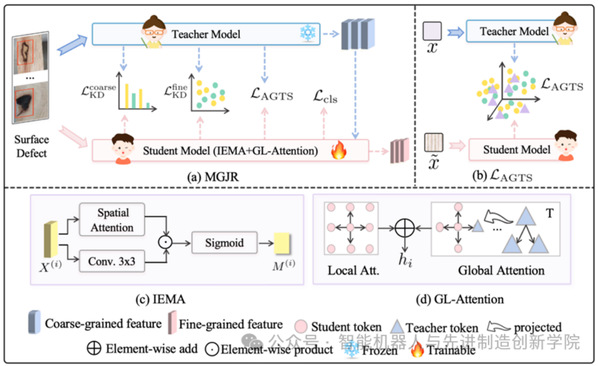 研究提出了一种多粒度师生联合表征学习(MGJR)框架,该框架将粗粒度和细粒度的表征学习集成在统一的架构中,基于ViT的教师网络首先从富含缺陷的背景中学习整体的全局特征。这些特征引导学生网络,并通过集成高效多注意力(IEMA)模块和全局-局部注意力(GL-Attention)机制进行增强,从而能够提取和融合多尺度特征,在保留上下文信息的同时突出局部异常。锚引导训练策略(AGTS)充当了一致性约束,通过在噪声输入下将教师模型的稳定粗粒度信号与学生模型的细粒度响应对齐,增强了鲁棒性。整个框架使用统一的损失函数进行端到端优化,该损失函数将粗粒度指导与特定任务的监督相结合。大量实验表明,MGJR在NEU-CLS数据集上实现了99.98%的准确率,并在多个工业基准测试中始终优于先前的方法。