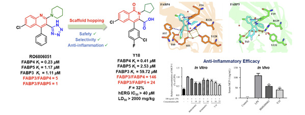 RO6806051是由罗氏公司开发的FABP4/5双靶点抑制剂,但同时显示出强的FABP3抑制作用。研究团队以RO6806051为先导,基于前期对抑制剂与FABP3及FABP4/5的作用方式的差异分析,通过骨架跃迁策略发现了一类含有异喹啉酮骨架的新型FABP4/5双靶点抑制剂,并实现了对FABP3的高选择性。通过构效关系研究、体内外抗炎活性评价和类药性评价等确定化合物Y18为候选化合物,其对FABP4和FABP5显示出强效抑制活性,Ki值分别为0.41 μM和2.53 μM,对FABP3的Ki值为59.72 μM,选择性显著优于RO6806051(FABP3 Ki/FABP4 Ki=5, FABP3 Ki/FABP5 Ki=1)。Y18具有良好的药代动力学特性,口服生物利用度为32%,口服Y18能减轻LPS诱导的肝损伤。该化合物表现出优秀的安全性—hERG抑制作用弱(IC50>40 μM)、细胞毒性低(IC50>40 μM)及半数致死剂量高(>2000mg/kg)。