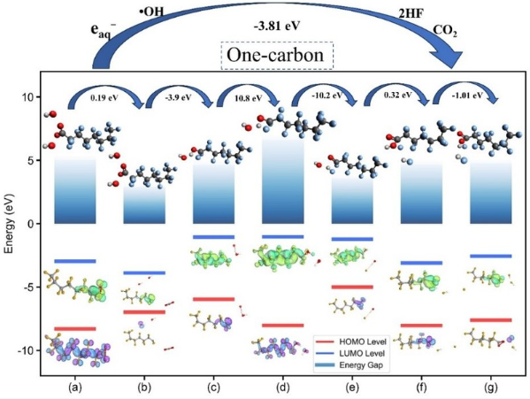 研究强调了eaq⁻和•OH在降解反应中的双重作用,并证明碱性条件有助于将PFOA保留在液滴中,防止其蒸发进入气相。通过离子色谱和与质谱联用的超高效液相色谱(UHPLC-MS)分析降解产物,并通过量子化学计算进行确认,单碳降解途径可能是主要过程,TFA是重要产物之一。