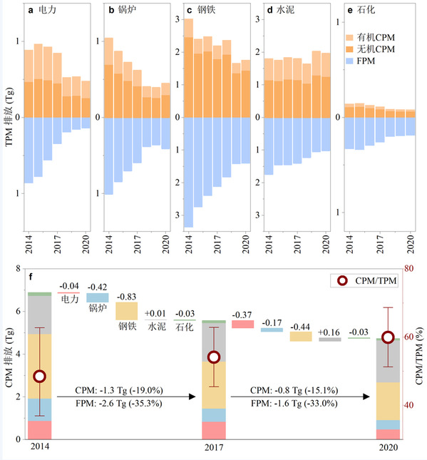研究团队通过对全国148个典型燃煤电厂、工业锅炉、钢铁、水泥与石化厂的CPM进行实地采集与实验室化学分析,获得可靠的 CPM与FPM排放比率数据。将该比率耦合至中国颗粒物排放清单中,估算得到2014–2020年我国工业源CPM排放动态变化。结果显示,在此期间,CPM在固定源颗粒物排放中的占比从48.5%上升至59.9%,已成为颗粒物主导组分。2014–2017年CPM排放量下降19.0%,2017–2020年进一步下降15.1%。将CPM排放输入大气化学传输模型进行模拟,结果表明,2019年1月,CPM对全国PM2.5浓度的贡献达到14.5±8.5%,在京津冀、长三角和珠三角等重点区域,CPM的贡献比例更是高达30%。研究进一步预测,若维持现有控制策略,到2030年,CPM在固定源颗粒物排放中的占比将攀升至76%。