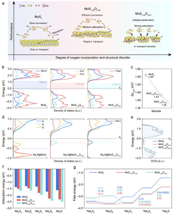9月13日,材料科学系赵婕团队通过电子调谐和结构无序化解锁室温钠硫电池,相关研究成果以“Unlocking Room-Temperature Sodium–Sulfur Batteries Through Electronic Tuning and Structural Disordering in Oxygen-Incorporated MoS2”为题,发表于Advanced Energy Materials。研究团队提出了一种基于氧元素掺入和结构无序工程的协同催化剂设计策略,成功开发了具有精确调谐电子特性和结构无序度的氧掺杂二硫化钼(MoS2)纳米片。