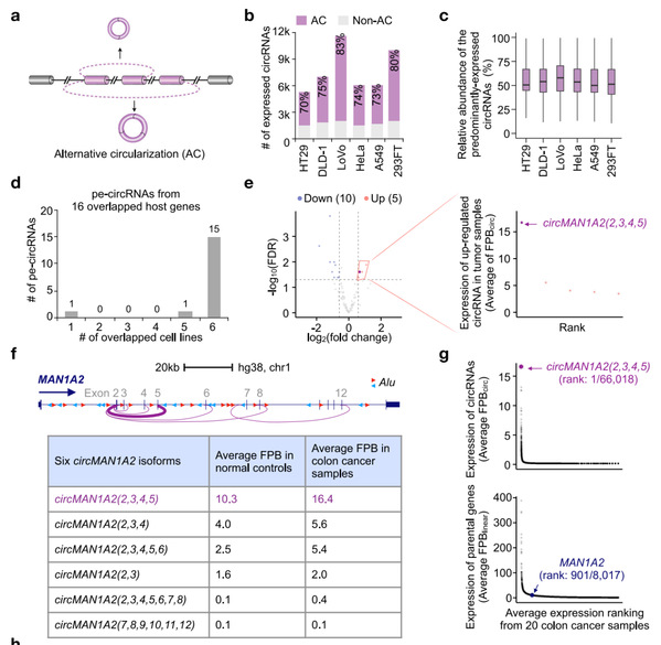 研究团队对多个细胞系和结直肠癌组织中的可变环化图谱进行了系统剖析,确定了每个 AC 基因位点中主要表达的环状 RNA。结果显示,除了大多数排名靠前的 pe-circRNA 在细胞类型中具有特异性表达外,在所检测样本中普遍表达的circMAN1A2(2,3,4,5)在细胞增殖和结直肠癌进展中发挥着重要作用。circMAN1A2(2,3,4,5)通过其特有的反向剪接连接位点直接与CENPB的mRNA的3'非翻译区(3' UTR)相互作用,从而增强了IGF2BP2介导的CENPB mRNA的稳定性。