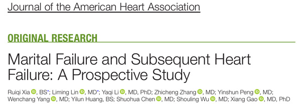 9月4日,公共卫生学院、营养研究院(筹)高翔教授团队联合开滦总医院通过多次随访评估的婚姻失败与后续心力衰竭(后续简称心衰)风险之间的关联,以“Marital failure and subsequent heart failure: a prospective study”为题,发表于Journal of the American Heart Association。