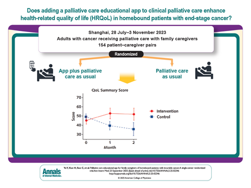 9月23日,人类表型组研究院陈兴栋等团队,联合复旦大学附属肿瘤医院赵苇苇、公共卫生学院索晨和梁霁团队开展了单中心随机临床试验,相关成果以“Palliative Care Educational App for Family Caregivers of Homebound Patients With Incurable Cancer: A Single-Center Randomized Trial”为题,发表于Annals of Internal Medicine。