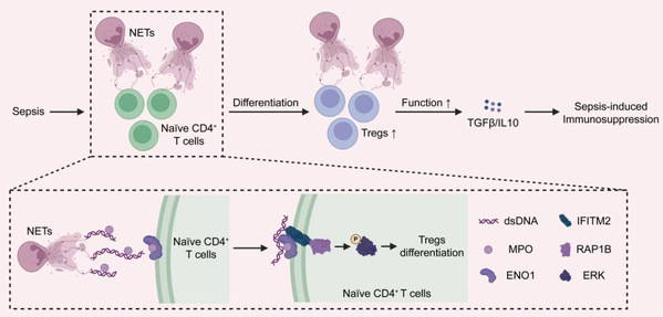 研究揭示了NETs通过促进Treg分化参与脓毒症免疫抑制的作用,明确了烯醇化酶1(ENO1)作为NETs-MPO的锚定蛋白,阐明了IFITM2-RAP1B-ERK信号轴调控Treg分化的分子机制。NETs通过与CD4+T细胞直接相互作用增强Treg的分化与功能,具体机制为NETs借助其关键蛋白MPO锚定CD4+T细胞膜上的ENO1,进而招募IFITM2。IFITM2作为DNA受体识别NETs-DNA,激活细胞内RAP1B及其下游ERK信号通路,促进Treg的分化与功能。