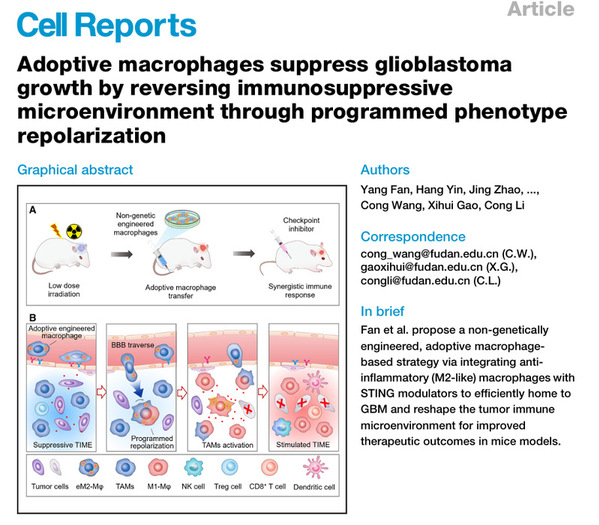 9月30日,药学院李聪教授团队提出了程序性调节过继巨噬细胞表型技术,在促进细胞肿瘤入脑归巢情况下逆转胶质瘤免疫抑制微环境,相关研究成果以“Adoptive Macrophages Suppress Glioblastoma Growth by Reversing Immunosuppressive Microenvironment through Programmed Phenotype Repolarization”为题,发表于Cell Reports。