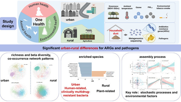 研究发现家庭环境是儿童暴露于ARGs与病原体的重要“储存库”,且其污染特征、群落构成及生态过程在城乡之间存在显著差异。乡村儿童家庭灰尘呈现出更多样性的ARGs,这可能与农业生产中的抗生素使用密切相关,并存在通过食物链等途径向人类传播的潜在风险;相比之下城市儿童家庭灰尘则显著富集了与人类健康直接相关的病原体,特别是临床上亟须关注的多重耐药菌株。研究还揭示了温度、绿化度等环境因素对ARGs分布的影响,以及随机性过程在ARGs和病原体群落构建中的主导作用。