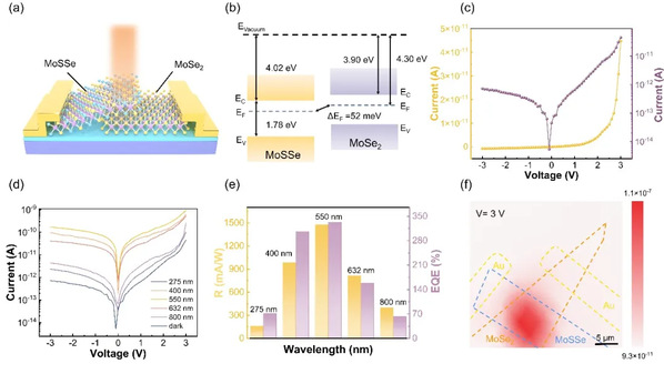 研究团队采用三元合金MoSSe与MoSe2形成Type-Ⅱ型能带异质结,利用合金工程有效抑制了硫空位缺陷,同时通过能带工程在界面处产生强内置电场,显著提升了载流子分离效率。在550 nm光照下,器件通过3V偏压的“电子增益”得到的等效外量子效率(EQE)高达470%,零偏压下的暗电流仅为5×10-15 A,比探测率达到2.4×109 Jones。研究团队通过空间分辨光电流谱等先进表征手段,系统分析了异质结界面的载流子产生、分离和传输动力学过程。