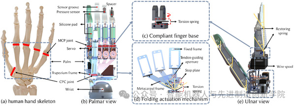 研究团队提出了一种创新的“扇形手”设计方案。扇形手采用独特的扇形折叠机制,仅用一个驱动器就能实现手掌的内收和外展运动,模拟人手掌骨关节的复杂运动模式。紧凑型可重构手掌设计核心创新在于扇形折叠机制,仅用一个驱动器就能协调控制所有手指基部的内收外展运动,实现了显著的结构简化。整个机器人手仅使用6个驱动器和5个传感器,相比同类产品成本降低了70%以上。自适应柔顺基座设计 每个手指根部配备自适应旋转基座,通过扭转弹簧提供被动适应能力。