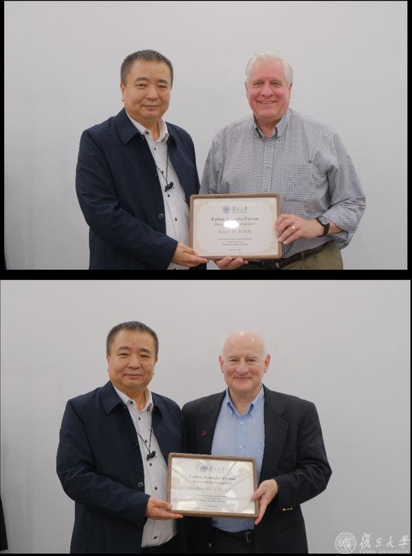复旦大学校长、中国科学院院士金力向两位主讲人颁发“复旦大学相伯讲堂”荣誉证书。