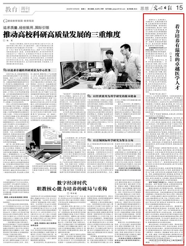 为进一步深入学习贯彻习近平总书记对复旦大学上海医学院博士生医疗服务团重要勉励精神,2025年10月28日,复旦大学党委副书记、上海医学院党委书记袁正宏在光明日报发表署名文章《着力培养有温度的卓越医学人才》。